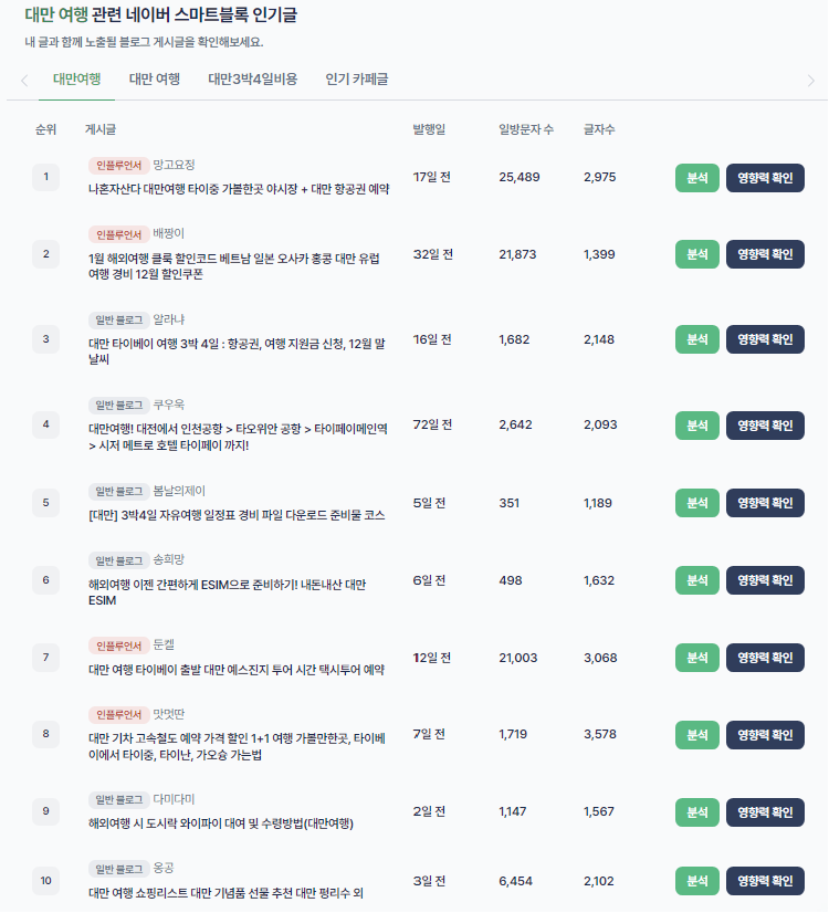 상단에 "인플루언서" 탭에서 "키워드 분석"을 클릭하면 키워드 정보를 얻을 수 있는 페이지로 이동합니다. 특정 키워드를 입력하면 경쟁강도, 월 검색량, 상위노출 유지기간, 연관 키워드 등 다른 사이트에 비해 더 자세한 키워드 정보를 얻을 수 있습니다.