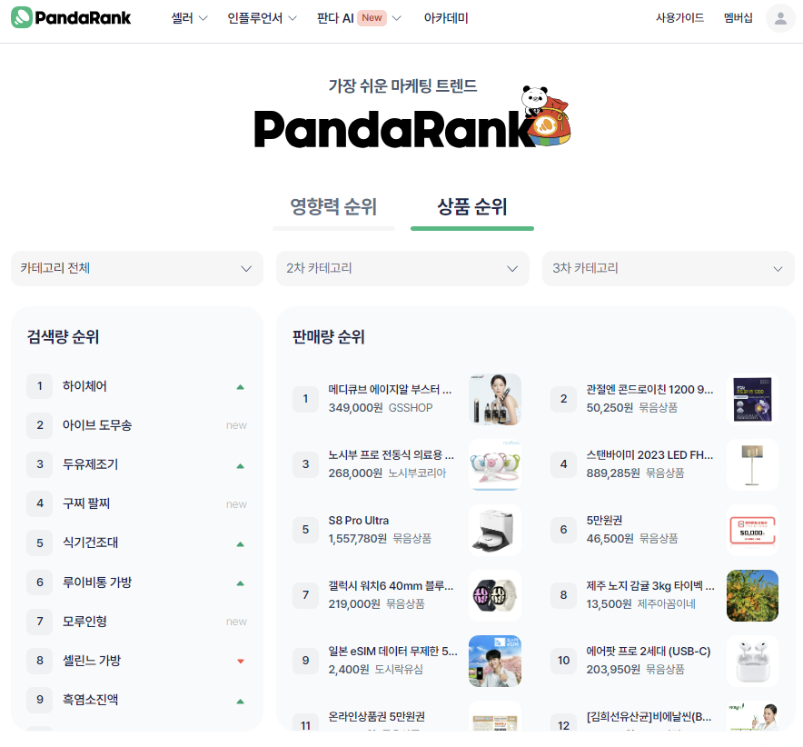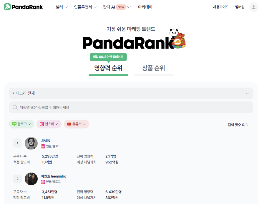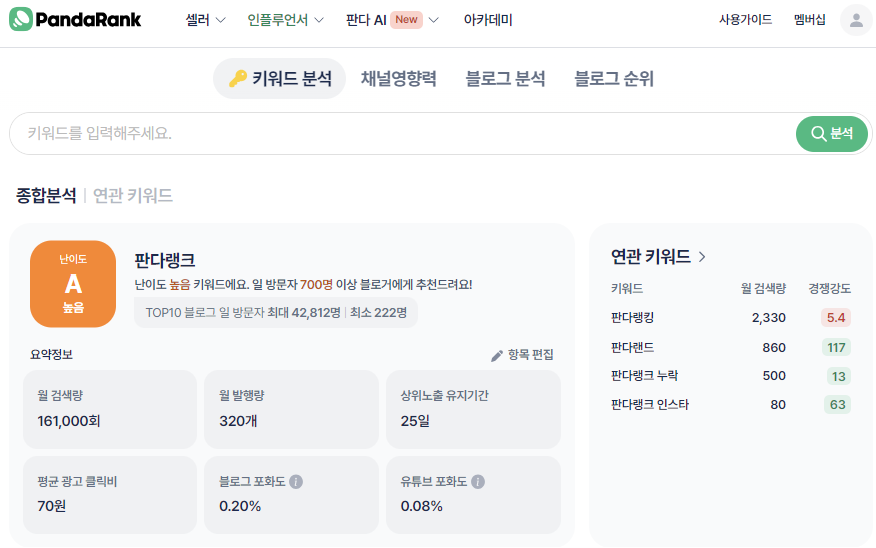 키워드에만 집중된 다른 서비스와는 달리 판다랭크는 마케팅 트렌드에 대한 전반적인 서비스를 제공합니다. 기본적으로 셀러 및 인플루언서에 대한 정보 및 해당 정보를 기반으로 키워드 정보를 제공합니다. 키워드 분석 서비스는 무료로 충분히 사용가능하며 블로그 분석 등 추가적인 서비스가 필요하신 분들은 멤버십 비용을 지불하시면 됩니다.