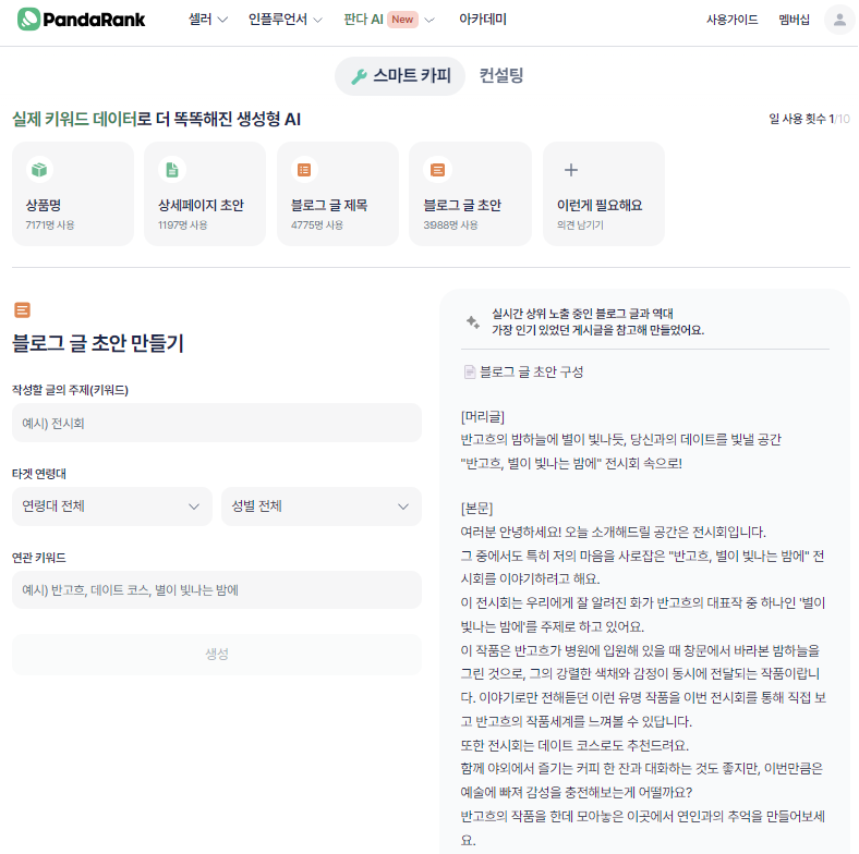 키워드를 찾았지만 전체적인 글에 대한 아이디어가 없을 때 "스마트 카피" 서비스를 통해 AI로 블로그 글 제목과 초안을 자동으로 만들어 볼 수 있습니다.